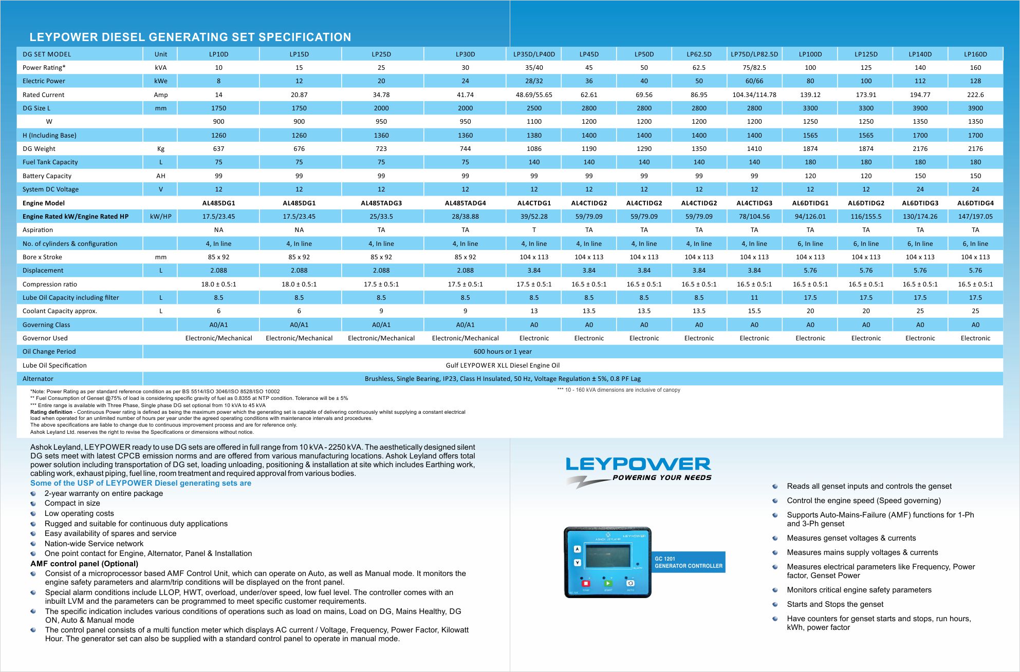 LEYPOWER ready-to-use diesel generating sets meet with the latest CPCB norms in India and built to comfortably meeting international norms. These sets are powered by the compact 4, 6 and 8 cylinder series of diesel engines. Aesthetically designed, these DG sets are silent, environment-friendly require minimum maintenance and are low on operating costs.