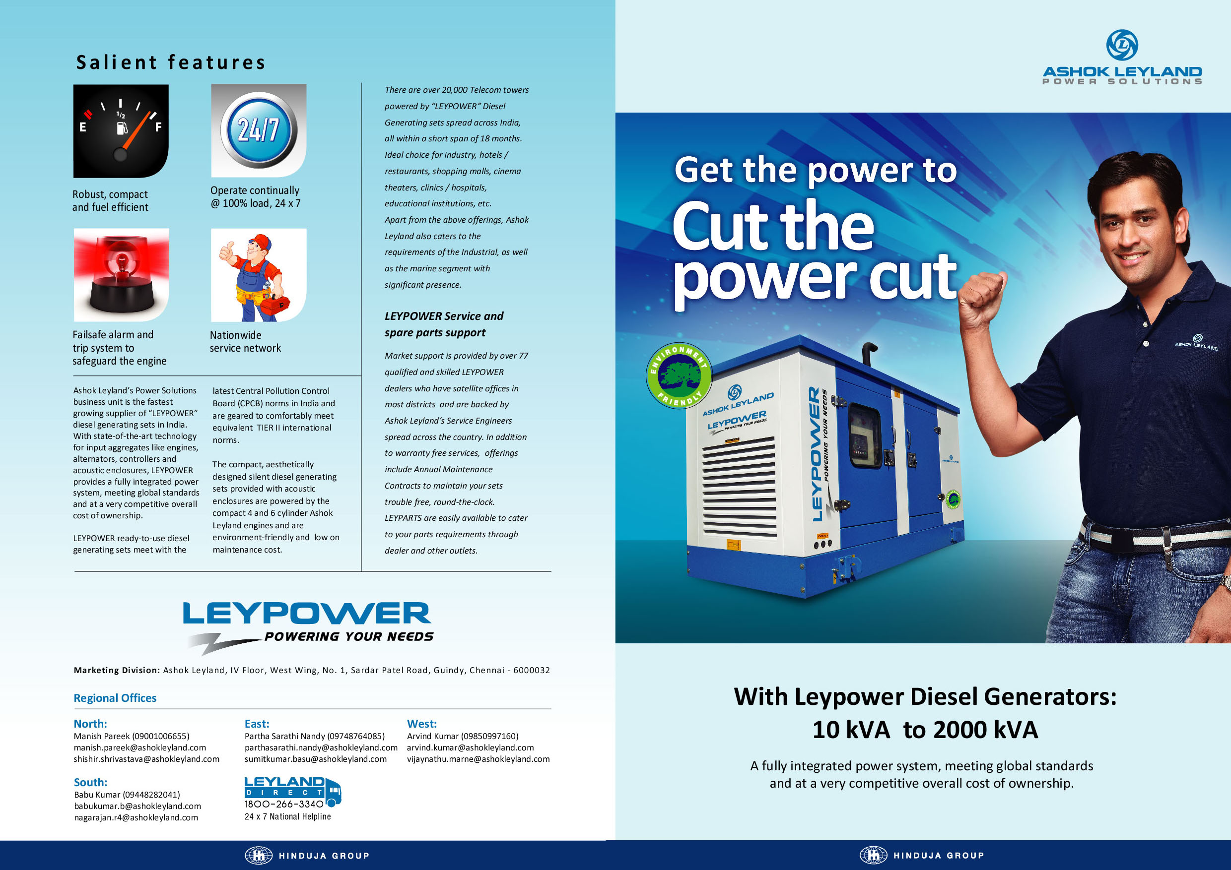 Ashok Leyland provide Power Solutions is the fastest growing genset provider in India. With state-of-the-art technology in engine, alternator and controllers, LEYPOWER provides a fully integrated power system at par with global standards at a very competitive overall cost of ownership.