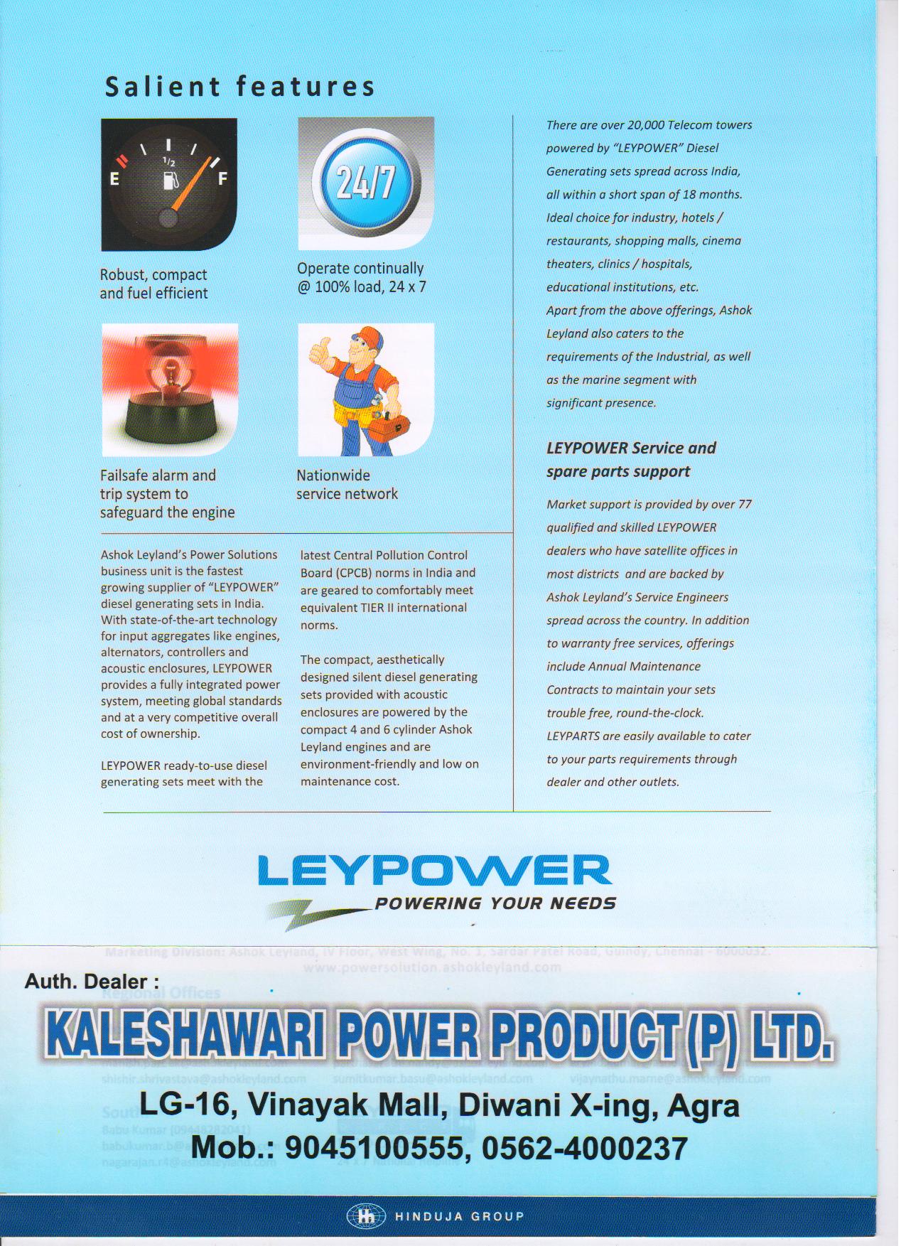 Ashok Leyland provide Power Solutions is the fastest growing genset provider in India. With state-of-the-art technology in engine, alternator and controllers, LEYPOWER provides a fully integrated power system at par with global standards at a very competitive overall cost of ownership.